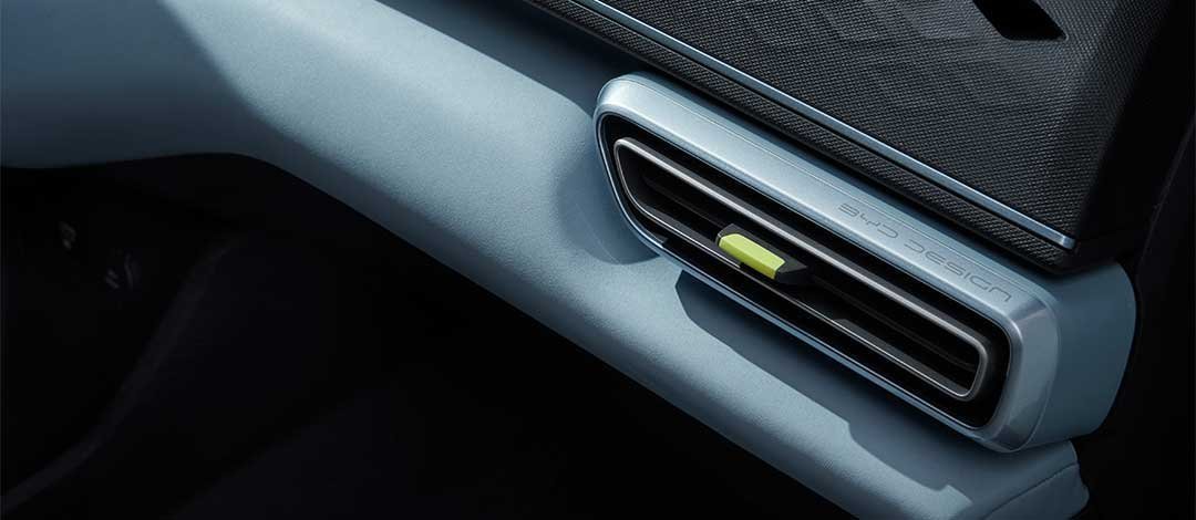 Ventilasi AC BYD Atto 1 bergaya cyberpunk dengan garis tegas dan aksen warna modern, menghadirkan kabin yang energik, futuristik, dan penuh karakter.